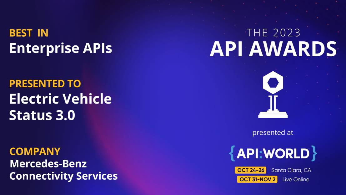 Wir freuen uns, dass das innovative Datenprodukt "Electric Vehicle Status 3.0", das wir gemeinsam mit unseren Kolleginnen und Kollegen der Mercedes-Benz AG entwickelt haben, den API Award 2023 in der Kategorie Best in Enterprise APIs gewonnen hat. Die API Awards 2023 feiern die unglaubliche technische Innovation, Akzeptanz und Wertschätzung in der API- und Microservices-Branche sowie die Nutzung durch eine globale Entwickler-Community. Sie wurden kürzlich bei der Verleihung der API Awards 2023 während der API World 2023, einer API- und Microservices-Konferenz und -Ausstellung, vorgestellt.