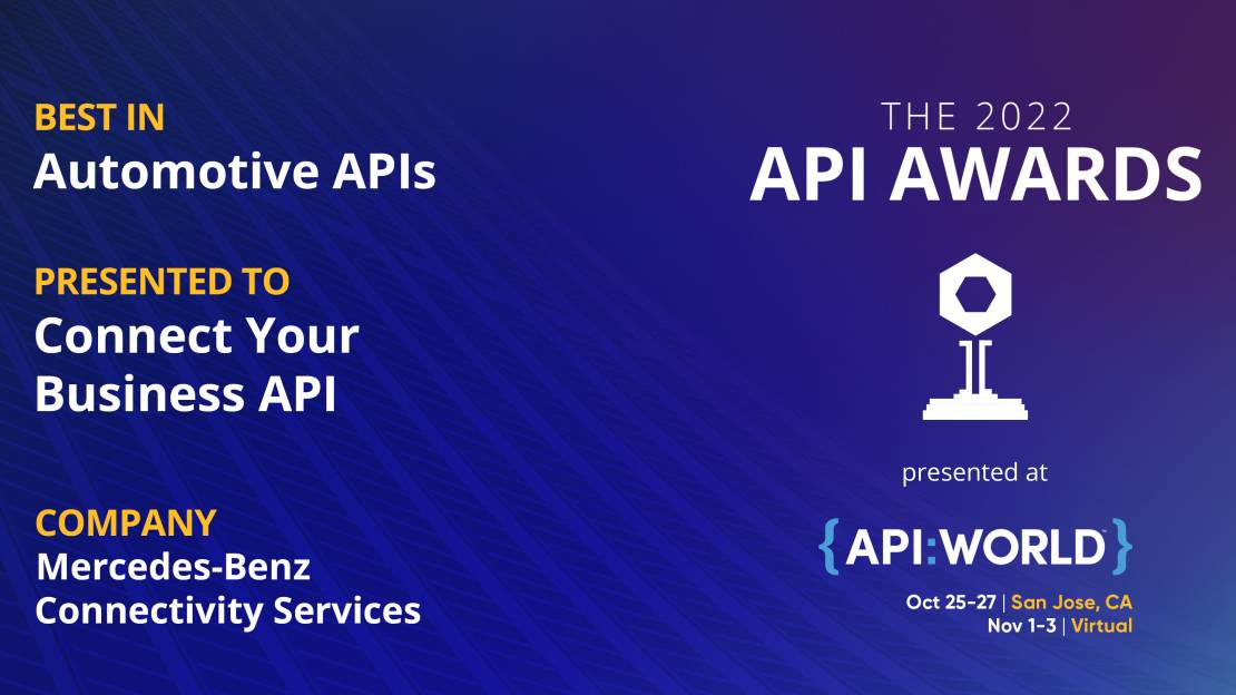 We are more than thrilled to announce that our innovative Mercedes-Benz Fleet Partner API has won a 2022 API Award in the Best in Automotive APIs category. The 2022 API Awards celebrate the incredible technical innovation, adoption and reception in the API & Microservices industries and use by a global developer community. They will be presented at the API Awards Ceremony during API World 2022, the world’s largest API & microservices conference & expo in its 11th year, with over 4,000 attendees.